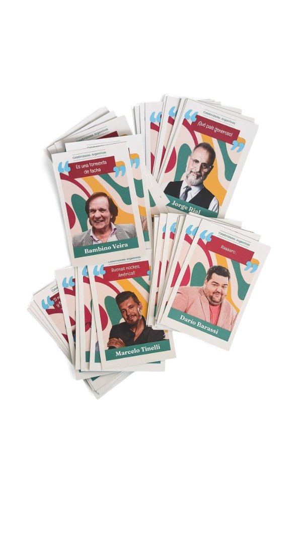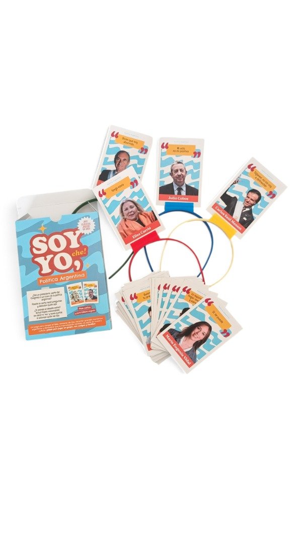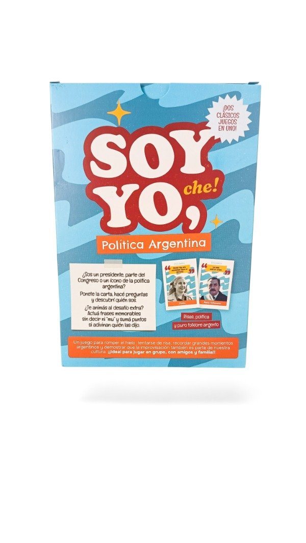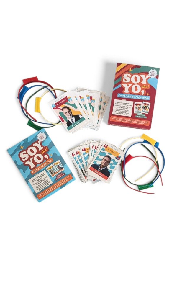 “Soy yo, che” incluye frases célebres de los personajes, esas que todos escuchamos alguna vez. En equipos, tomarán al azar una de las cartas con un personaje famoso de la farándula o la política argentina, tendrán que interpretarlas en 60 segundos, sólo con gestos y mímica, para que el equipo descubra qué frase es. En un total de 10 rondas irán sumando un punto por frases adivinadas. Si además descubren quién la dijo, ¡Obtiene un punto extra! Gana el equipo que más puntos consiga.